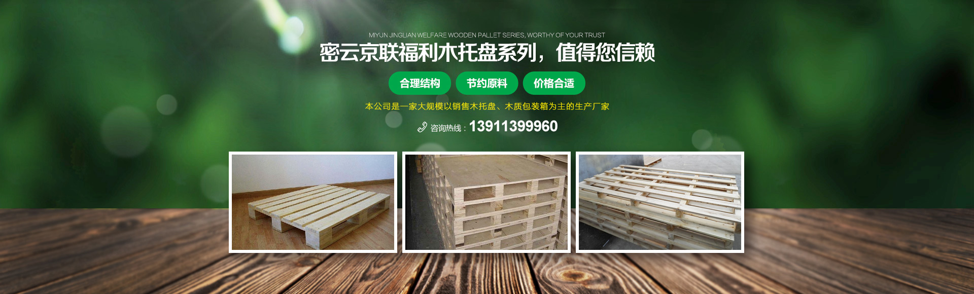 北京京聯(lián)國順木制品有限公司 (原北京市密云縣京聯(lián)福利木制品廠)成立于1993年,位于北京市密云縣西田各莊鎮(zhèn)蒼頭村,占地約5000平米。我公司工廠是一家大規(guī)模以銷售木托盤為主的生產廠家。本工廠是一家直接采購原木,按客戶要求生產規(guī)格尺寸的托盤,我公司工廠位于河北省承德市有著木材加工點,可以做到,從山上的木頭下山到客戶手中的托盤都是一手貨,減少了中間商的費用,所以我公司售出的產品對北京這個龐大的市場來說在同樣的規(guī)格尺寸的托盤來說價格比較占優(yōu)勢。